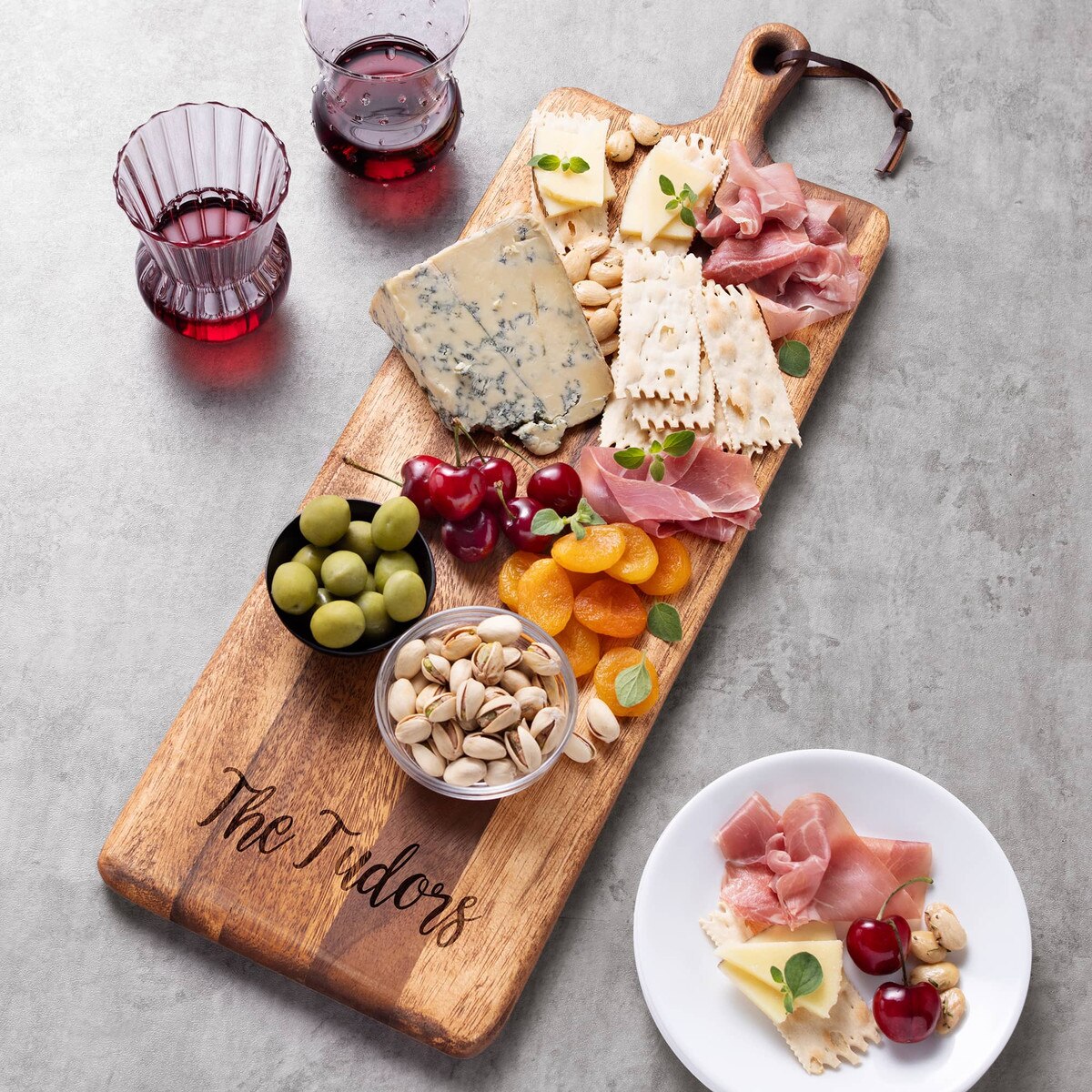 New & Exclusive! Laser Etched Acacia Wood Cheese Board Name (P/N 36928). Handmade from natural Acacia wood and shaped like a paddle, our new Acacia cheese board slimmer and sleeker than our previous Acacia board.