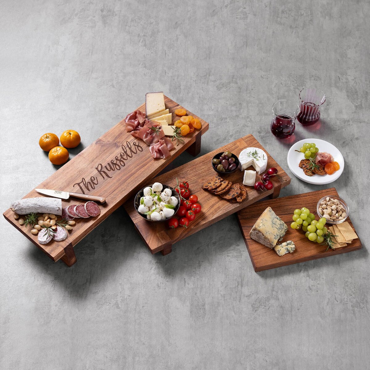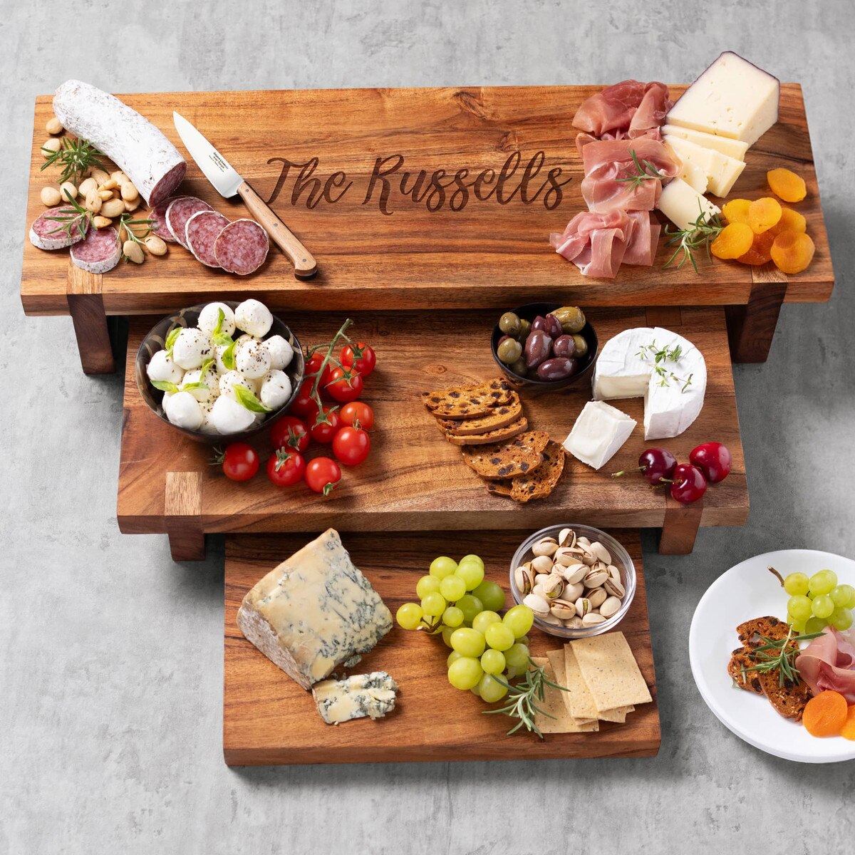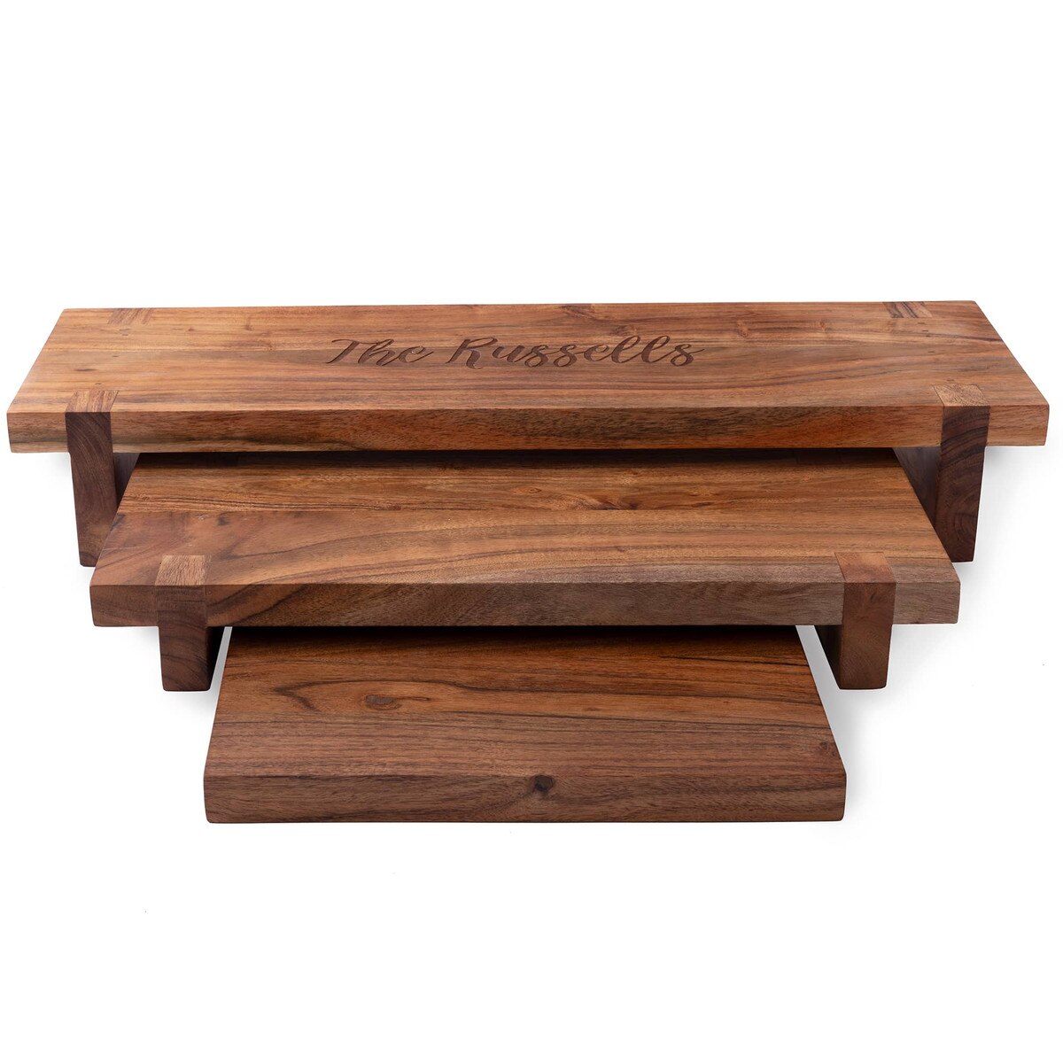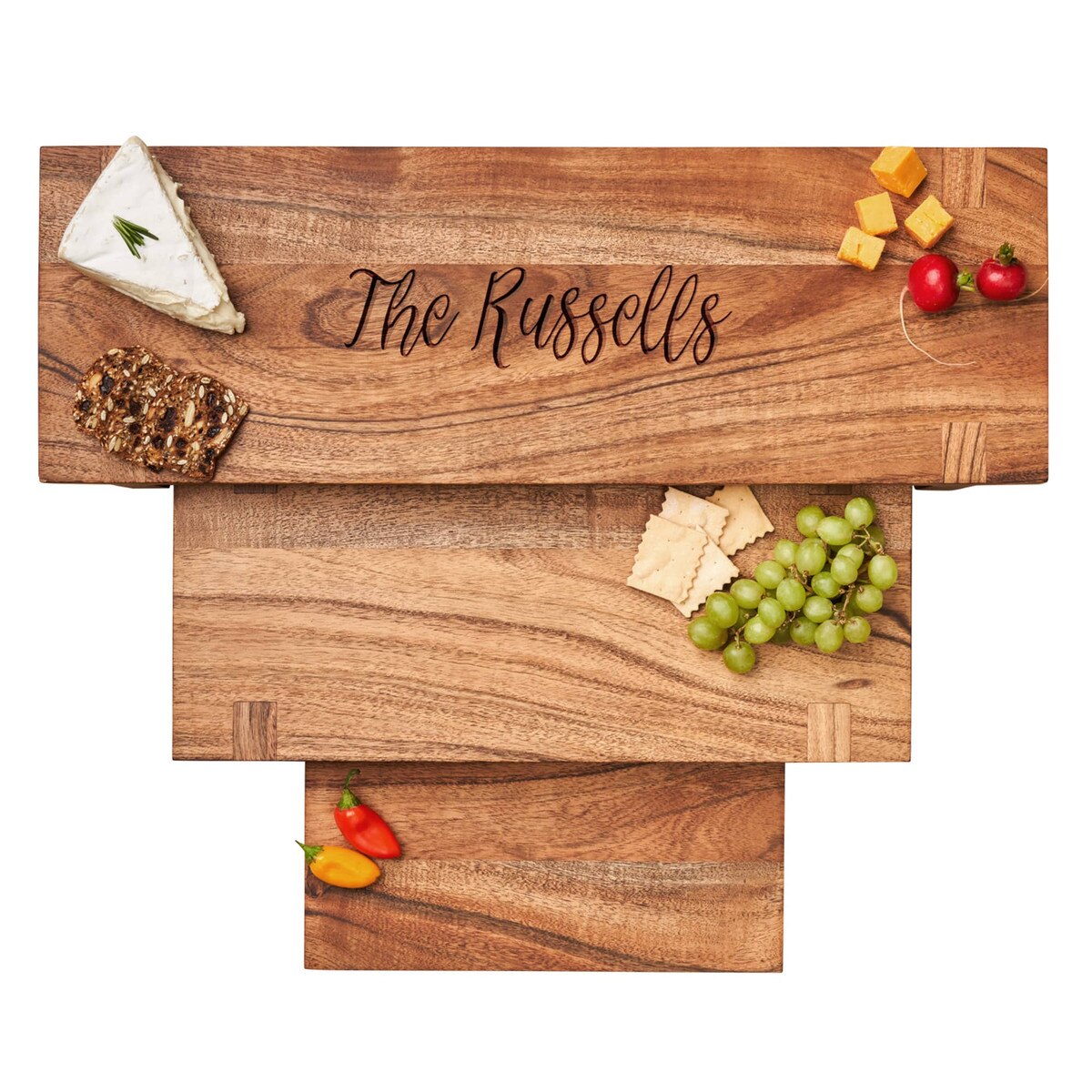 Laser Etched Acacia Nesting Cheese Boards (P/N 3708). Create a tiered presentation for a bountiful charcuterie spread with our Acacia Nesting Cheese Board set. The top board includes laser-etched personalization and all 3 boards cleverly nest together when not in use.