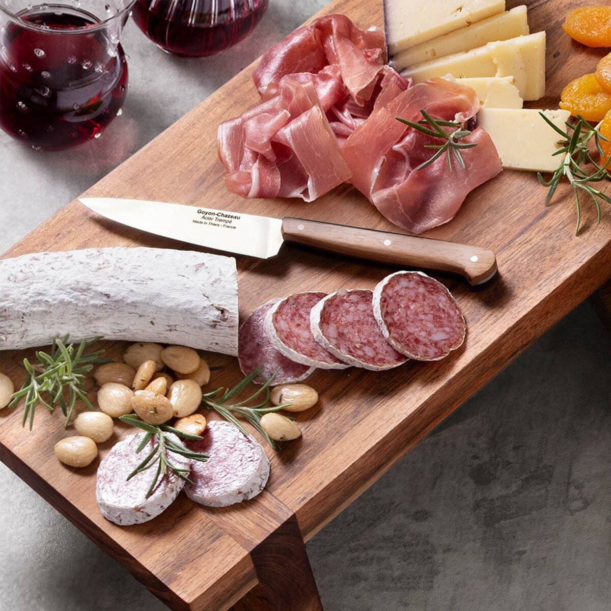 Charcuterie Paring Knife Ebony (P/N 36990). Made in France, this paring knife is laser-cut from and features a single steel spine that runs through the entire knife, and finished with natural ebony wood handles riveted into the steel core. Use to cut charcuterie like hard meats and cheeses, dried fruit and raw nuts.