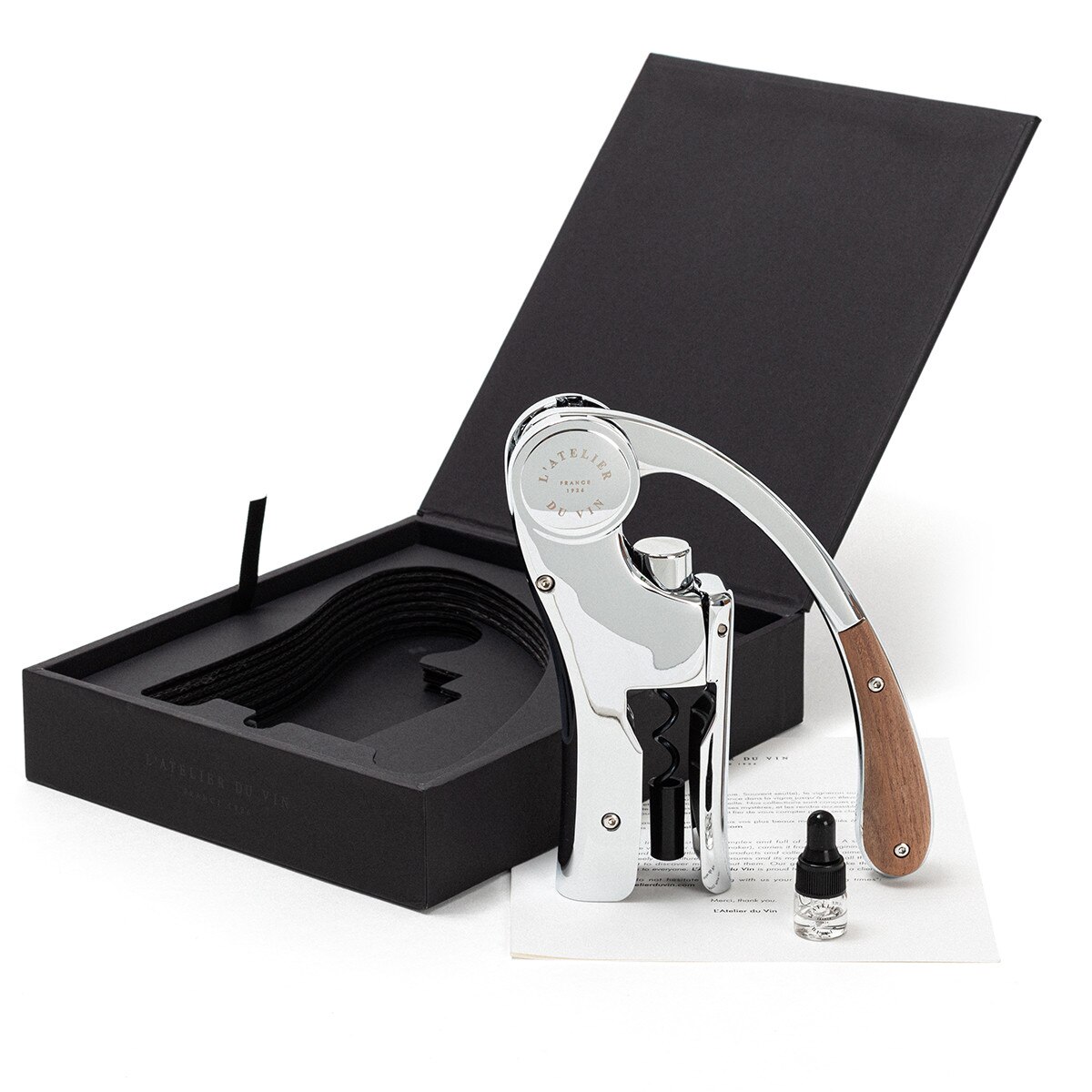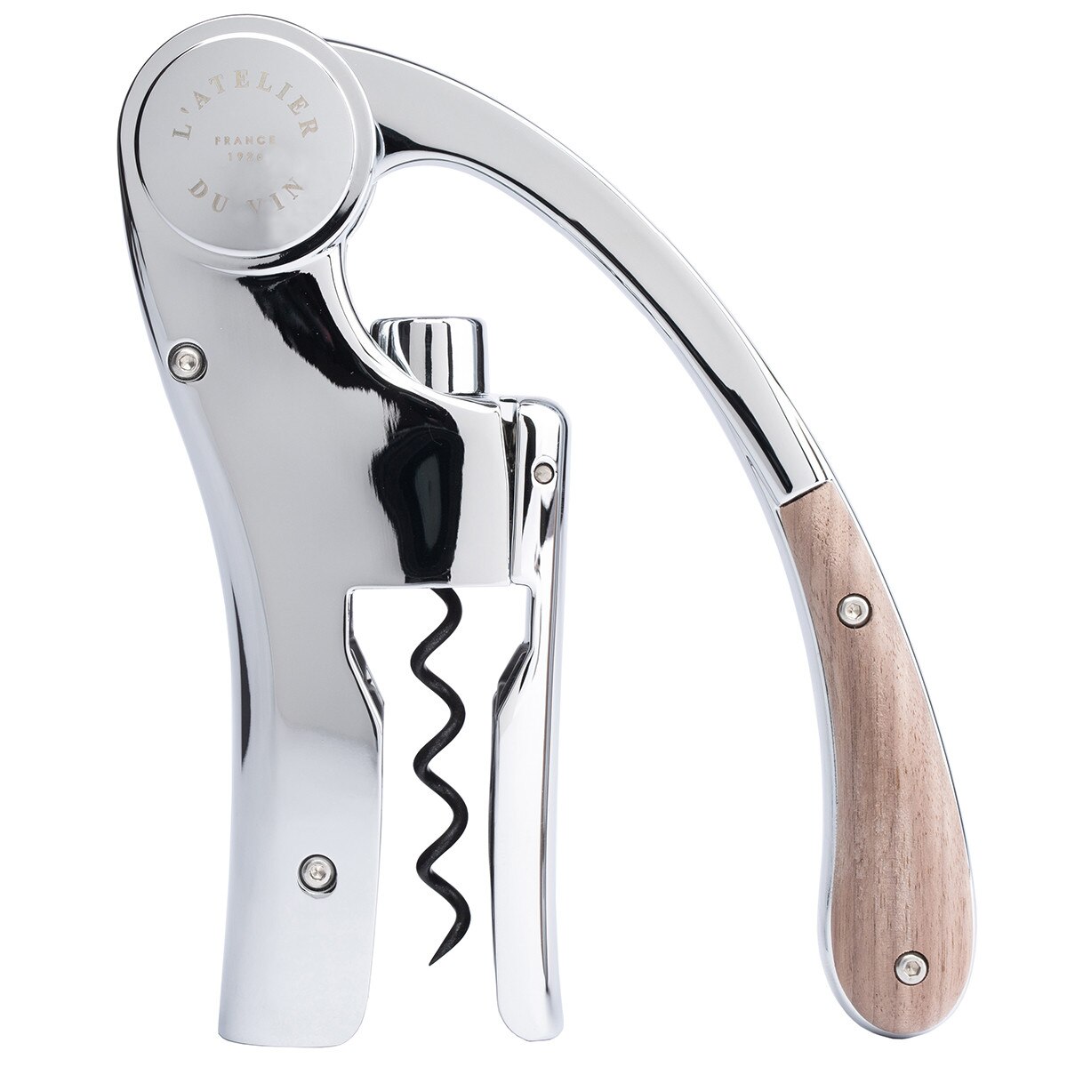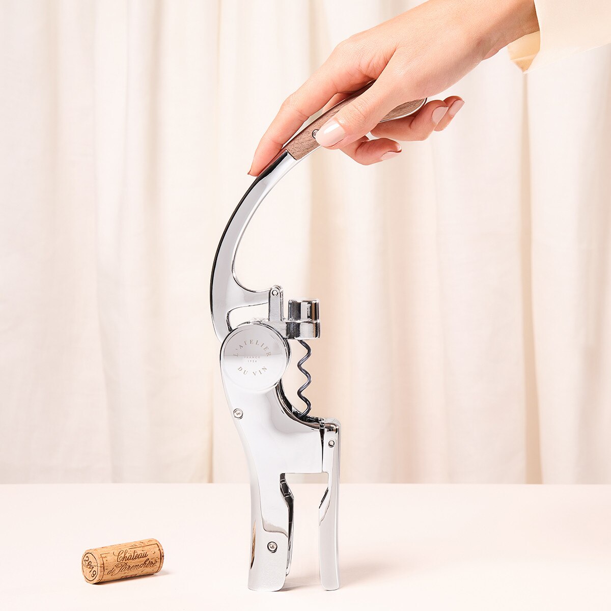 L'Atelier du Vin Oeno Opener Chrome & Wood (P/N 95464). Open your wine bottle with a single pull of the lever. After removing the foil with the integrated foil cutter, firmly grip the bottle, push the lever down to quickly penetrate the cork, then lift the lever to extract the cork in a single fluid movement.