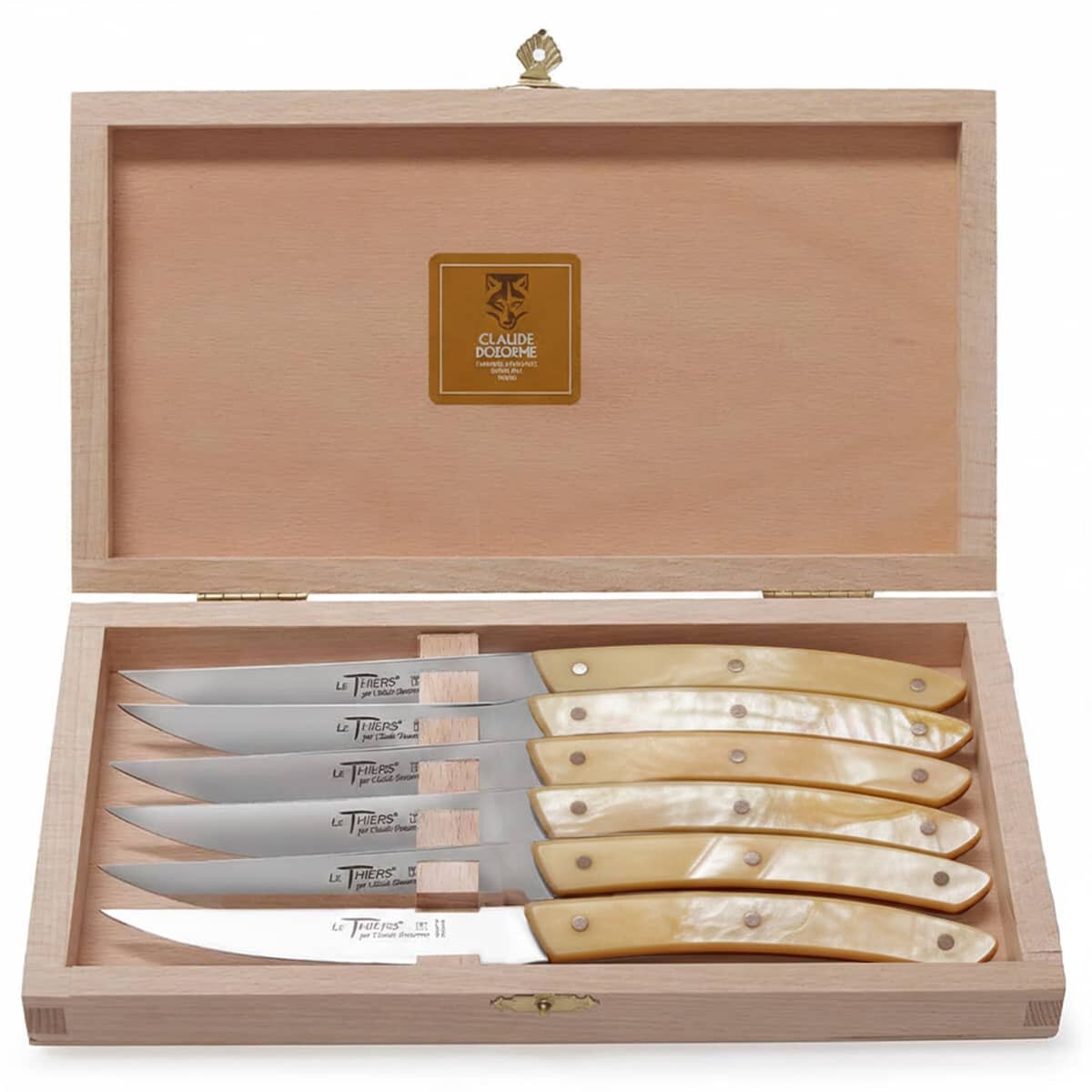 When a dinner table needs to hold its own alongside good wine and good company, the knives matter more than people expect. This set of six from Le Thiers — made in the French cutlery capital by Claude Dozorme — has the kind of presence that gets noticed without drawing attention to itself. The ivory acrylic handles have a warm, pearlescent depth that reads as polished without being flashy, and the carbon stainless steel blades, ground to a razor edge with a solid 2mm spine, cut through anything from a dry-aged ribeye to a firm wedge of aged gouda without hesitation. They arrive in a beechwood box with a brass-tone clasp, ready to give or ready to keep.