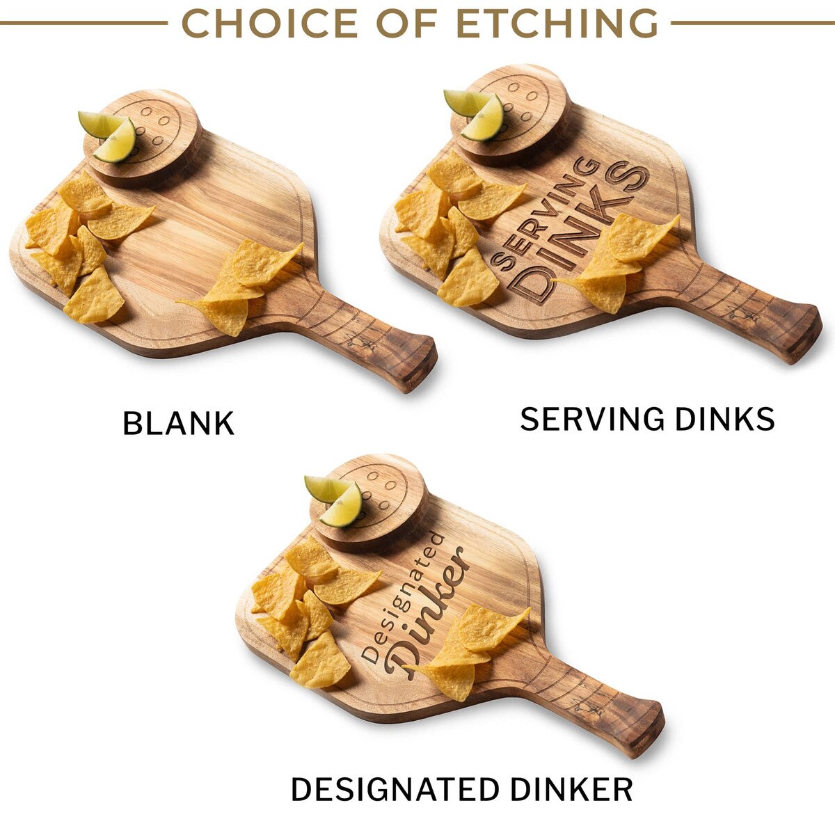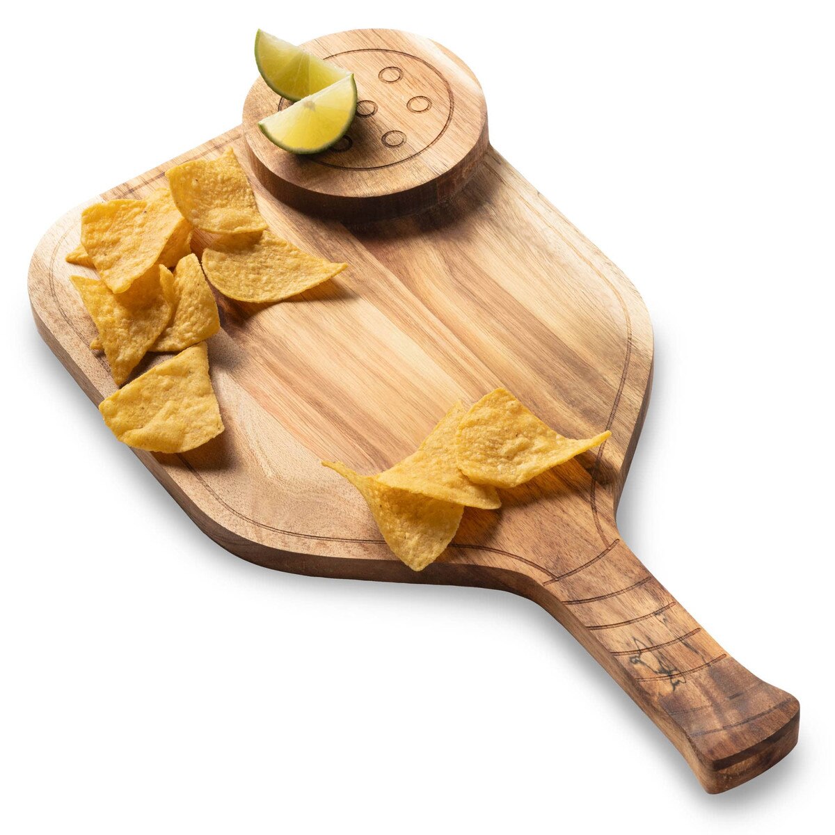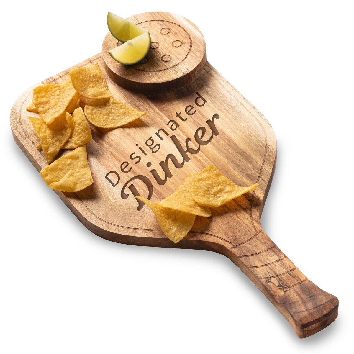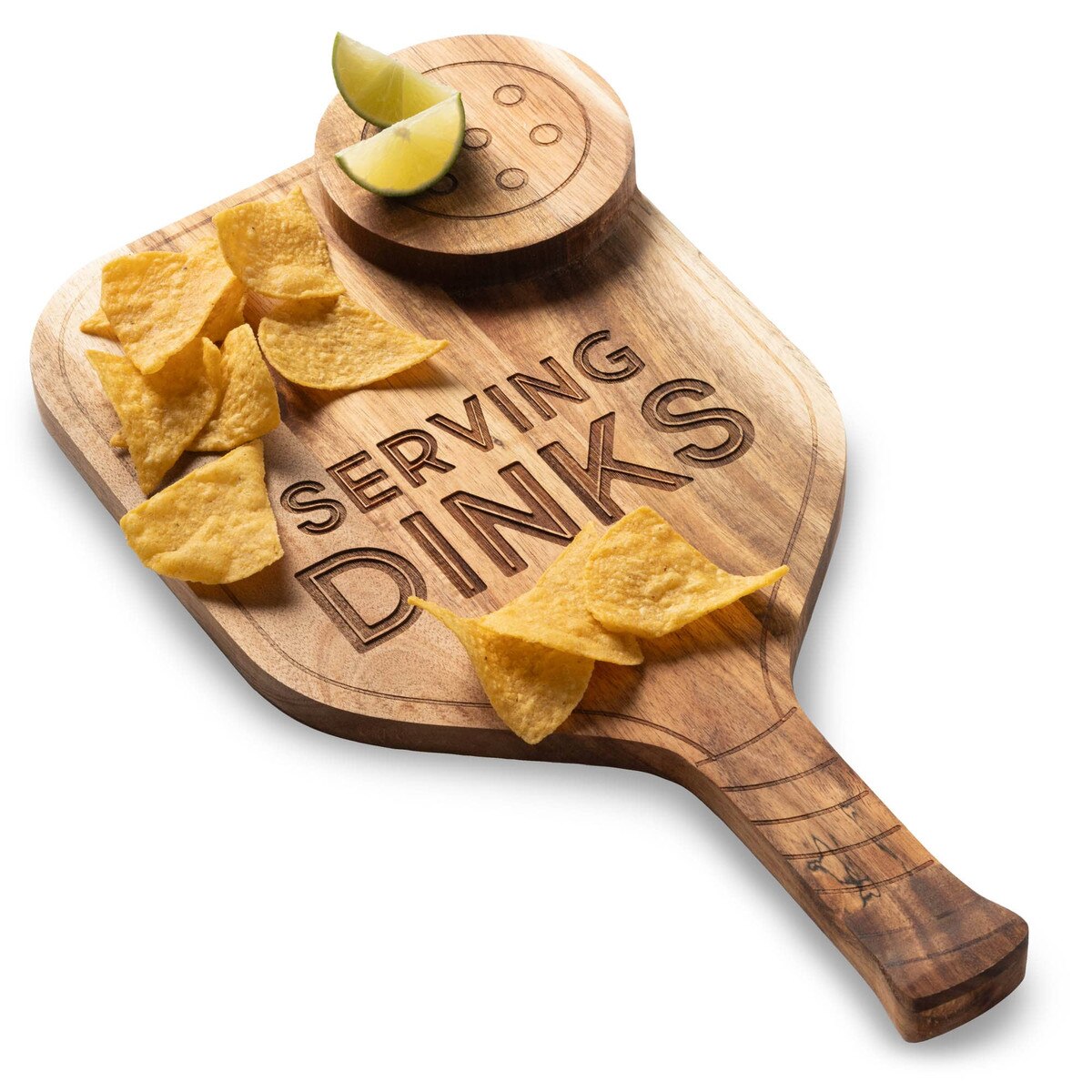 Pickleball Cheese Serving Board (P/N 37086). Made from natural Acacia wood, this charcuterie board is the ideal gift for all pickleball fans. The board is shaped like a pickleball racquet and includes an attached, slightly raised ball.