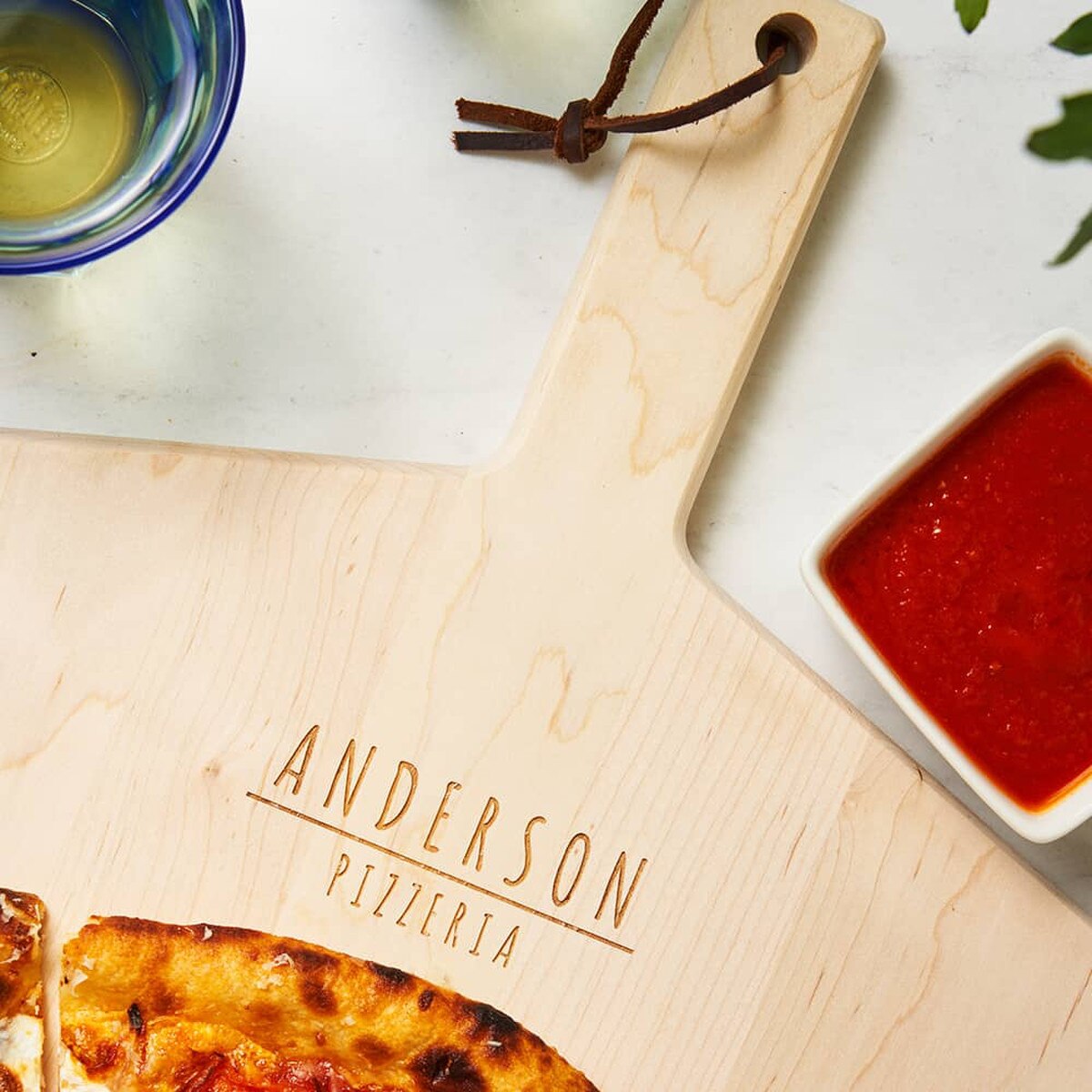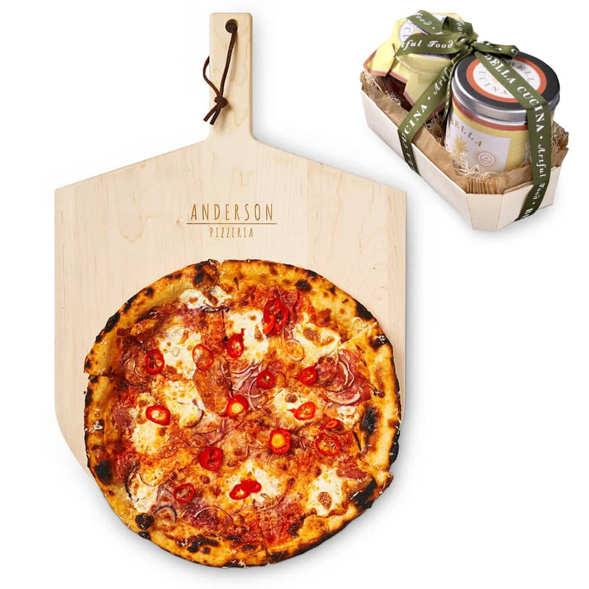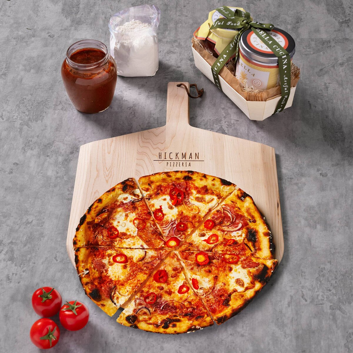 Special gift set includes personalized maple-wood pizza peel, focaccia dough mix and Italian pizza sauce.