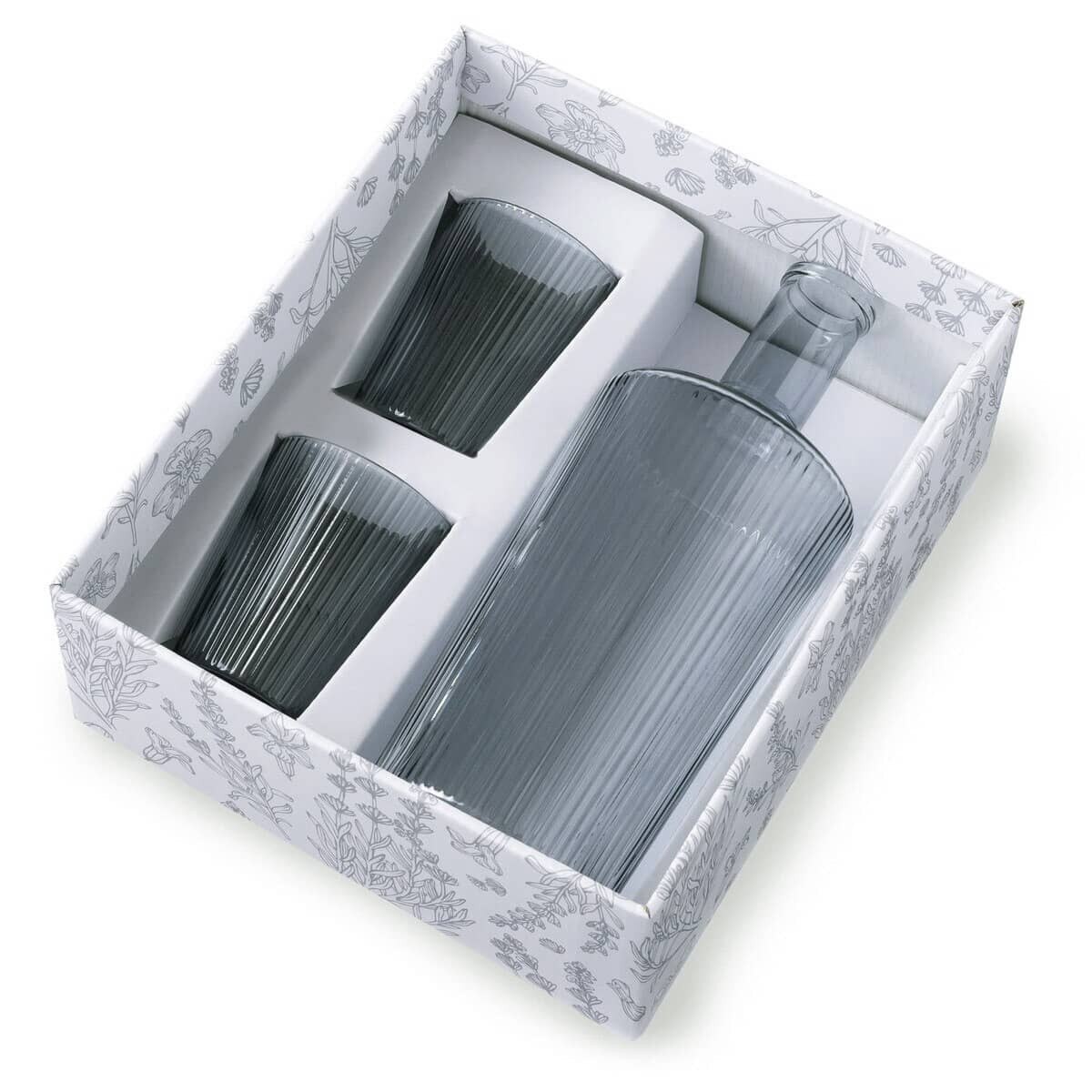 Ridge Carafe Gift Set Smoke (P/N 37019). Featuring clean lines, translucent color and practical versatility, our Ridge Water Gift Set includes a spill-proof carafe and 2 glasses that are perfect for nightstands and guest rooms. Packaged in a beautiful gift box.