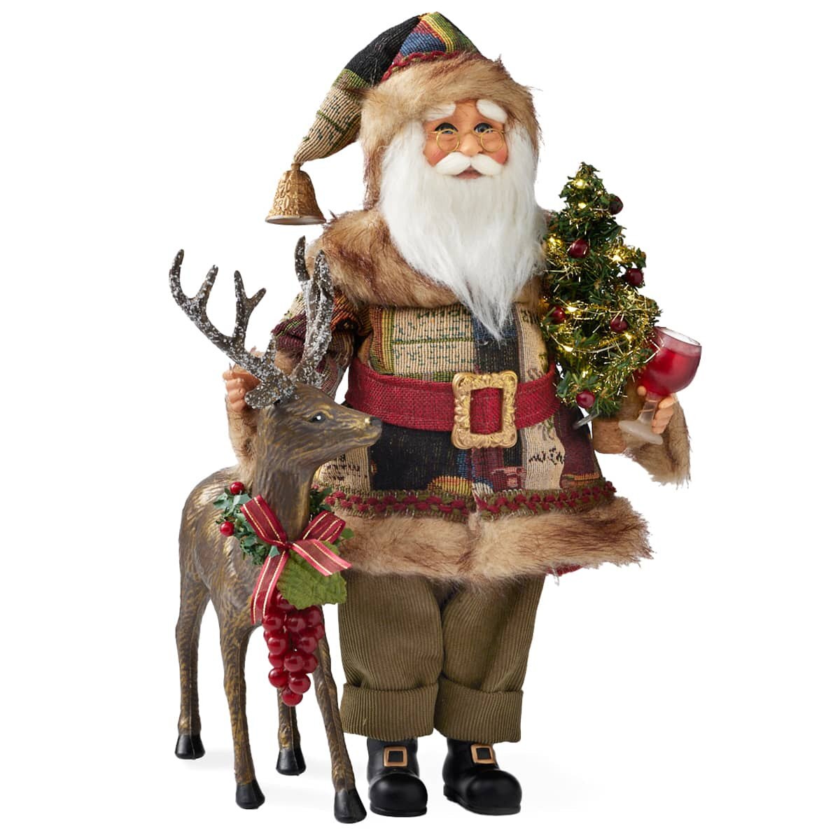 - In one hand, Santa holds a miniature Christmas tree and wine goblet of holiday cheer