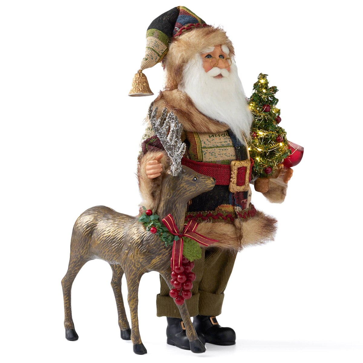 - Santa is dressed in a cozy, multi-colored woven coat trimmed with faux fur