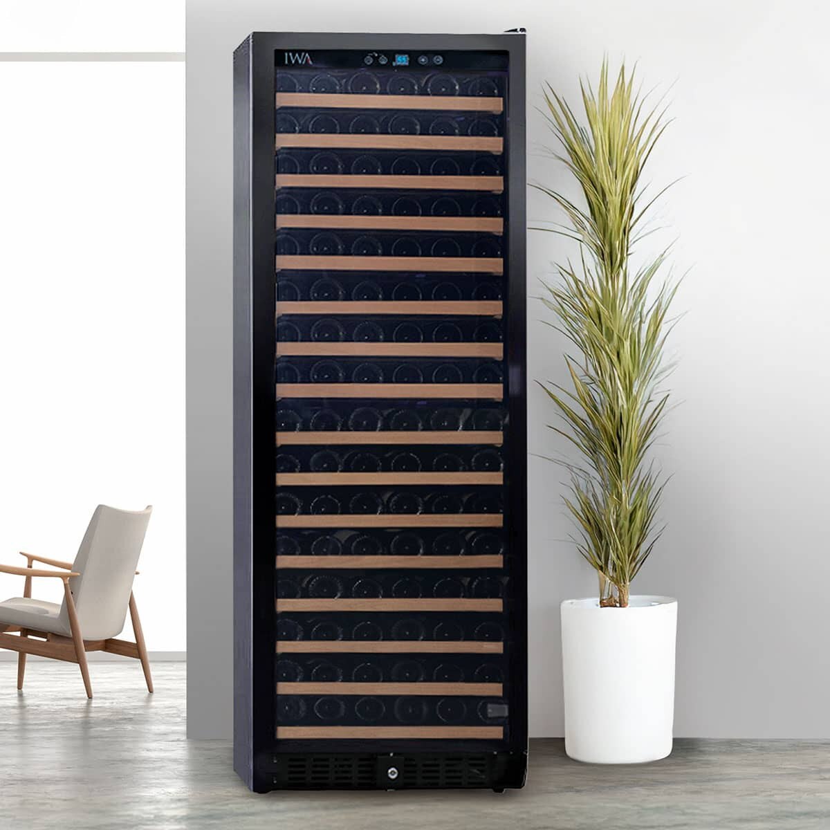 - 166-bottle capacity is rated for standard Bordeaux bottles — Burgundy, Champagne and larger-format bottles will reduce usable capacity. Plan accordingly if your cellar skews toward Pinot or Champagne.