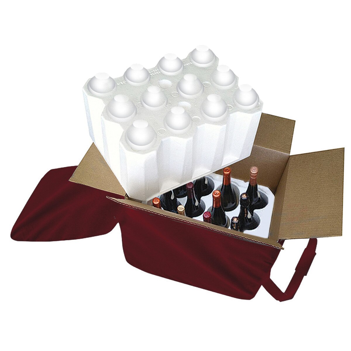 Compliant with FAA regulations, the VinCase bag, together with a shipper box and styrofoam case, rolls easily on 4 wheels and protects up to 12 bottles of wine as they travel in the belly of the plane.
