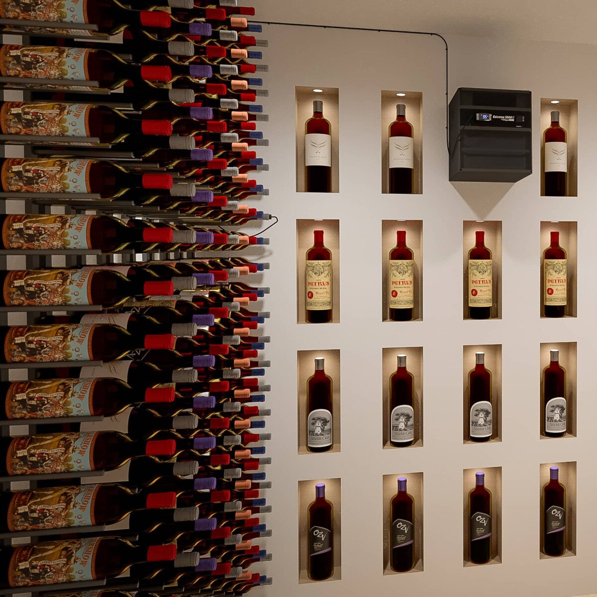 WhisperKOOL Extreme Wine Cooling Unit (P/N 5000ti). With the system set in the Low setting, you can maintain a 55°F cellar at an ultra quiet 51 decibels for the 5000ti and 57 decibels for the 8000ti. This fully featured line also includes WhisperKOOL's most advanced controller to keep all of the cellar vitals in check. Utilizing a series of monitoring probes inside the unit, the controller is able to ensure efficient high performance and long cooling unit life. Acceptable for mounting through exterior walls and can operate in a 110°F exhaust environments. Maintain 55°F and 50-70% relative humidity in properly insulated wine cellars up to 1000 cu. Ft.* (5000ti) or 2000 cu. Ft.* (8000ti) in size.