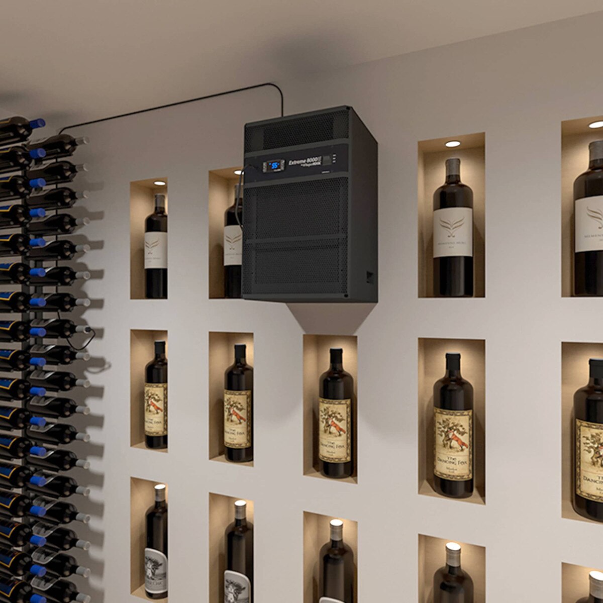 WhisperKOOL Extreme Wine Cooling Unit (P/N 8000ti). With the system set in the Low setting, you can maintain a 55°F cellar at an ultra quiet 51 decibels for the 5000ti and 57 decibels for the 8000ti. This fully featured line also includes WhisperKOOL's most advanced controller to keep all of the cellar vitals in check. Utilizing a series of monitoring probes inside the unit, the controller is able to ensure efficient high performance and long cooling unit life. Acceptable for mounting through exterior walls and can operate in a 110°F exhaust environments. Maintain 55°F and 50-70% relative humidity in properly insulated wine cellars up to 1000 cu. Ft.* (5000ti) or 2000 cu. Ft.* (8000ti) in size.
