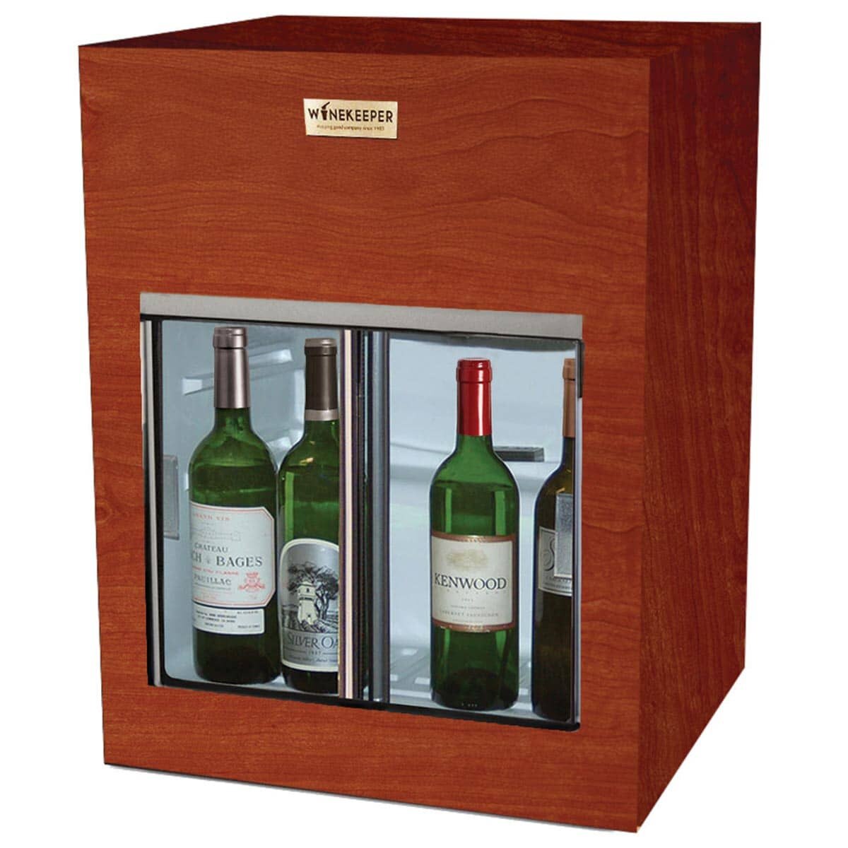 WineKeeper Monterey 4 Bottle (Mahogany) Dual Zone Display (P/N 37134). Store up to 12 bottles of wine at optimal temperature. The WineKeeper Monterey wine cooler has a professional look that fits in well with a commercial environment, or for the wine connoisseur at home. The temperature range in the Monterey for white wine is 42-48° F and 46-68°F for red wine. For optimum performance, a minimum vented air space of 1" each side, 3" behind, and 12" above the unit is required.