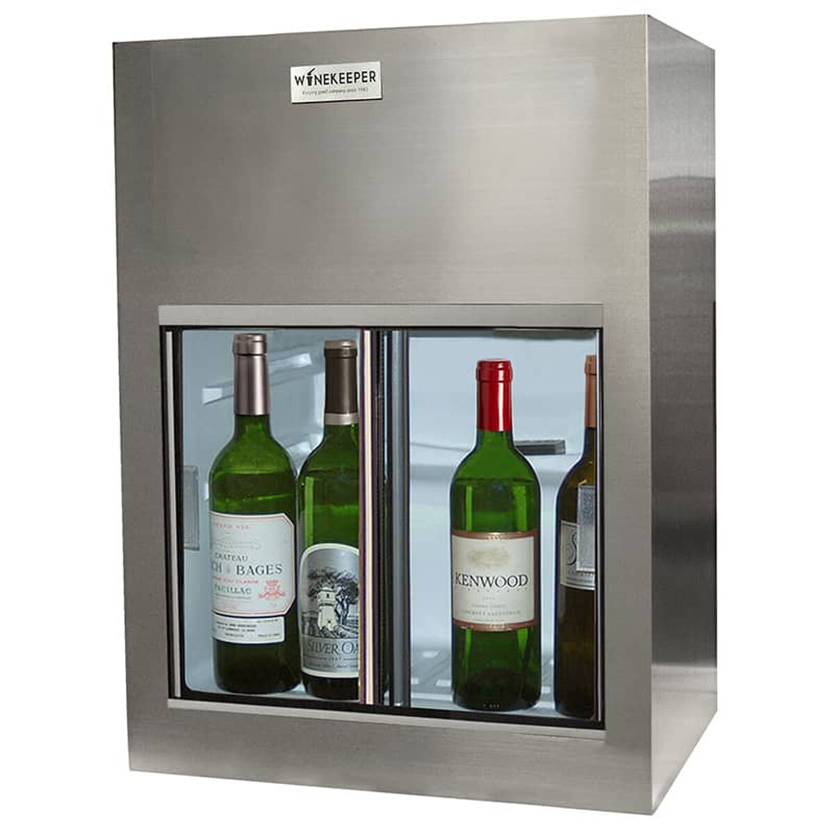 WineKeeper Monterey 4 Bottle (Special Laminate) Dual Zone Display (P/N 37135). Store up to 12 bottles of wine at optimal temperature. Default is aluma-steel, a 0.025" thick aluminum laminate which looks just like stainless, other options are available. The WineKeeper Monterey wine cooler has a professional look that fits in well with a commercial environment, or for the wine connoisseur at home. The temperature range in the Monterey for white wine is 42-48F and 46-68F for red wine. For optimum performance, a minimum vented air space of 1" each side, 3" behind, and 12" above the unit is required.