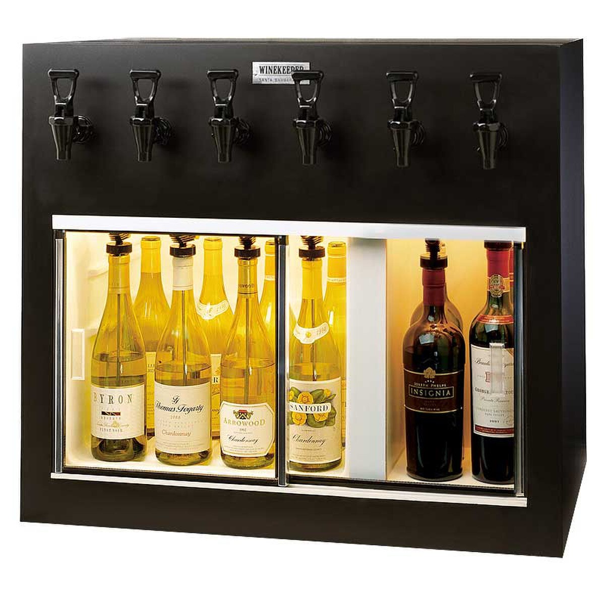 WineKeeper Monterey 6-Bottle (Laminate) (P/N 7767). Default laminate is black, other options are available. The WineKeeper Monterey wine preservation and dispensing system has a professional look that fits in well with a commercial environment, or for the wine connoisseur at home. A pressurized blanket of inert nitrogen or argon protects wine from spoiling and oxidation when being dispensed by the glass from opened bottles. The temperature range in the Monterey for white wine is 42-48° F and 46-68° F for red wine. For optimum performance, a minimum vented air space of 1" each side, 3" behind, and 12" above the unit is required.